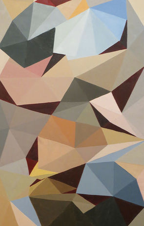 In my triangle series specifically, I generate a visual system of repeated geometric shapes that have personal underlying meanings, emotions, and narratives; but ultimately is not what piece is about. I want the viewer to be the presence of the work as if they are stuck in time of the composition. The viewer will decide what space is in relation to shape, color, and value. The paintings are significant and personal for me but relatable and ambiguous to the viewer. I emphasize the flatness of these triangles and force viewer to find it’s content. The series highlights the arrangement of colors and triangles, which creates an optical affect. Triangles are the only shapes used because the simplicity of their form can be manipulated into creating geometric fluidity. These triangles form color waves that holds a sense of structure. The treatment of the paint varies in this series from smooth, flat matte to raised textures. My color palette is influenced by my interest in flesh and the exploration of skin tones. This exploration can range from earthy neutrals to vibrant reds creating a large variety of color fields.